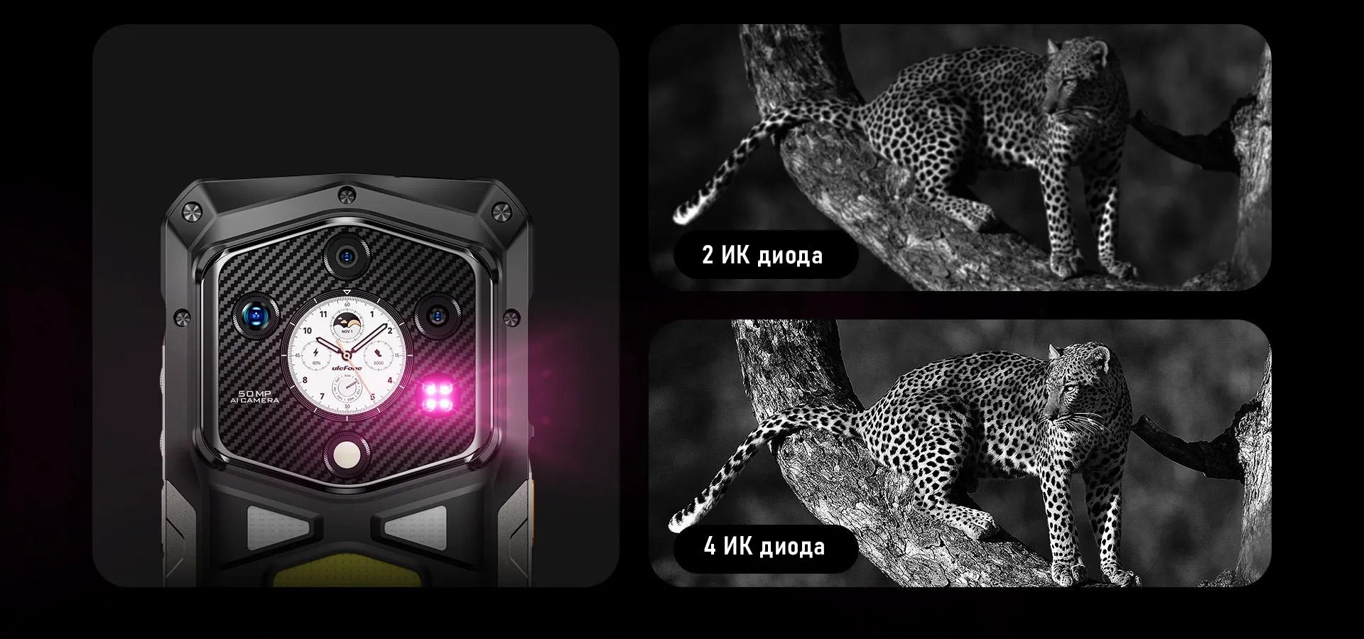 ИК 64Мп ночная камера OMNIVISION OV64B позволяет снимать в полной темноте благодаря технологии NightElf 3.0. 4 ИК светодиода подсвечивают картинку, обеспечивая превосходное качество изображения и детализацию на больших расстояниях.